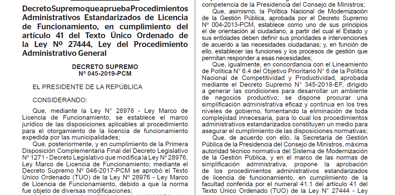 Norma legal: Decreto Supremo Nº 045-2019-PCM.